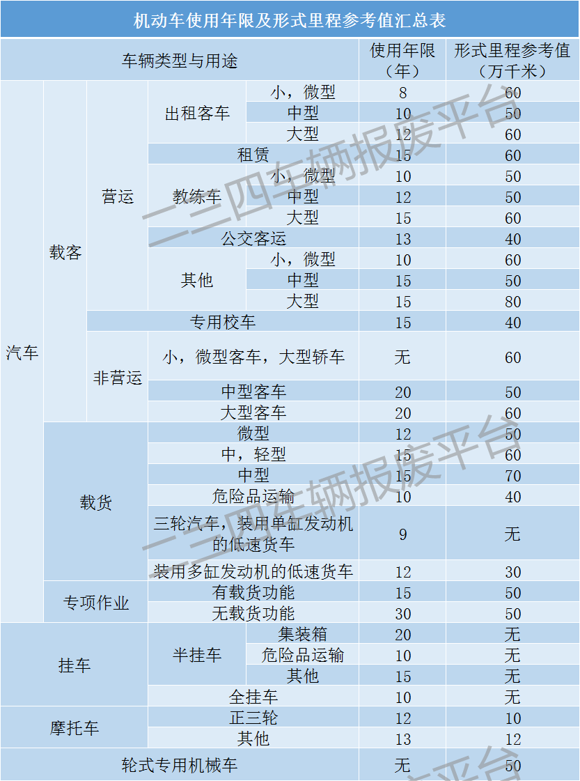 根据《2020车辆报废年限最新规定》:家用5座位轿车以及7座位的SUV,非营运的小、微型汽车无使用年限。在正常行驶里程达到了60万公里的,国家将引导报废(并不强制)。超过15年以后每年必须检验2次,检验不通过的,强制报废。